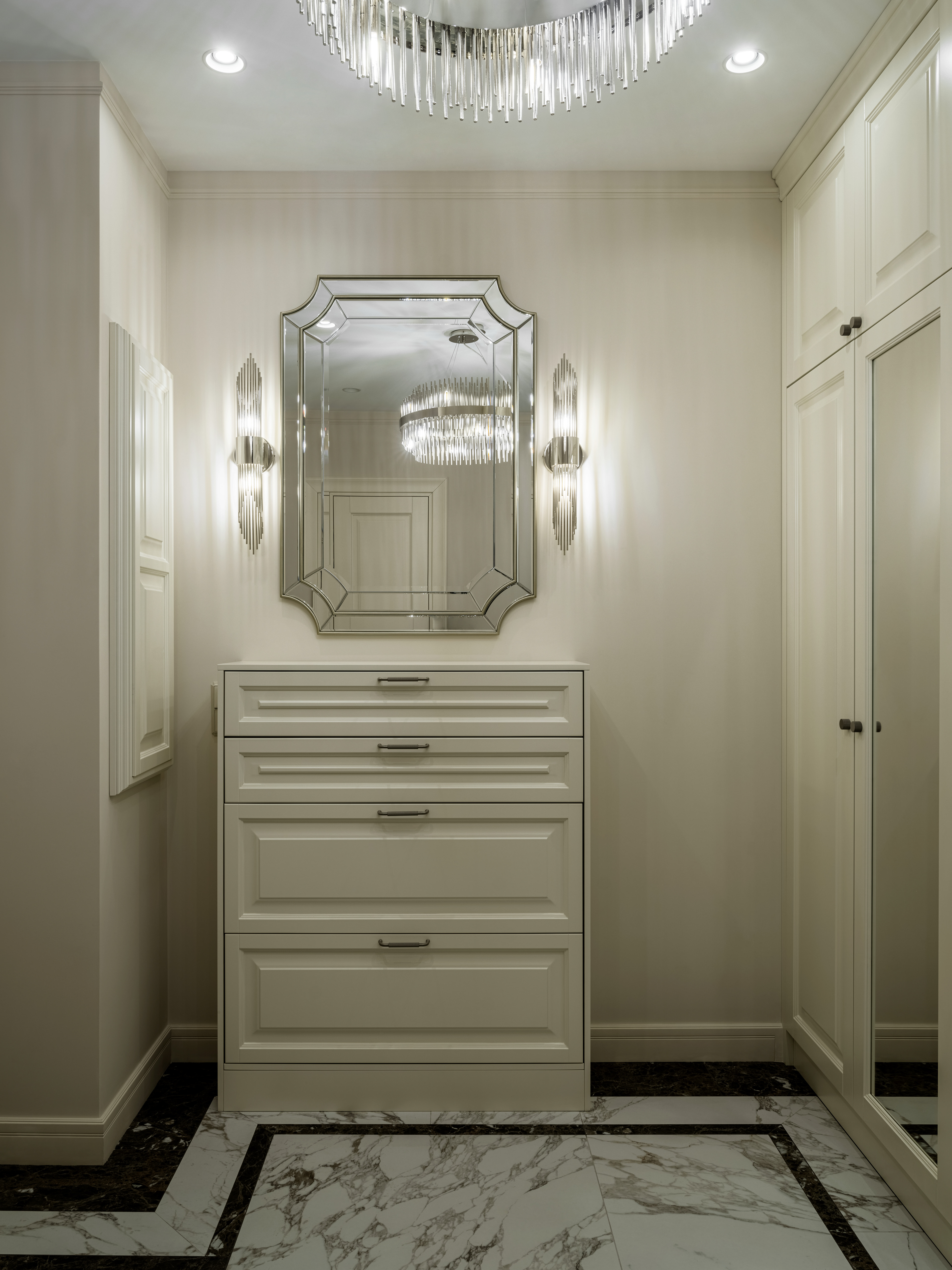 Акцентом в интерьере являются декоративные гипсовые элементы, светлая мебель и изящный текстиль.